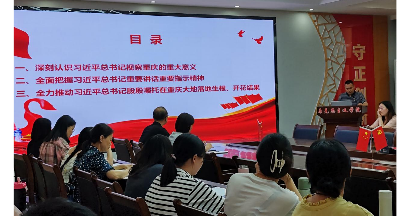 姜荣院长强调,习近平总书记视察重庆重要讲话重要指示精神,为新征程上重庆推进中国式现代化市域实践指明了前进方向、提供了根本遵循。全体教师要加大力度、拓展深度、延伸广度持续学习领会宣传贯彻精神内容,要以主人翁的责任意识扛起新使命,全力助推习近平总书记殷殷嘱托在学院落地生根、开花结果,助力新时代新征程新重庆建设。
