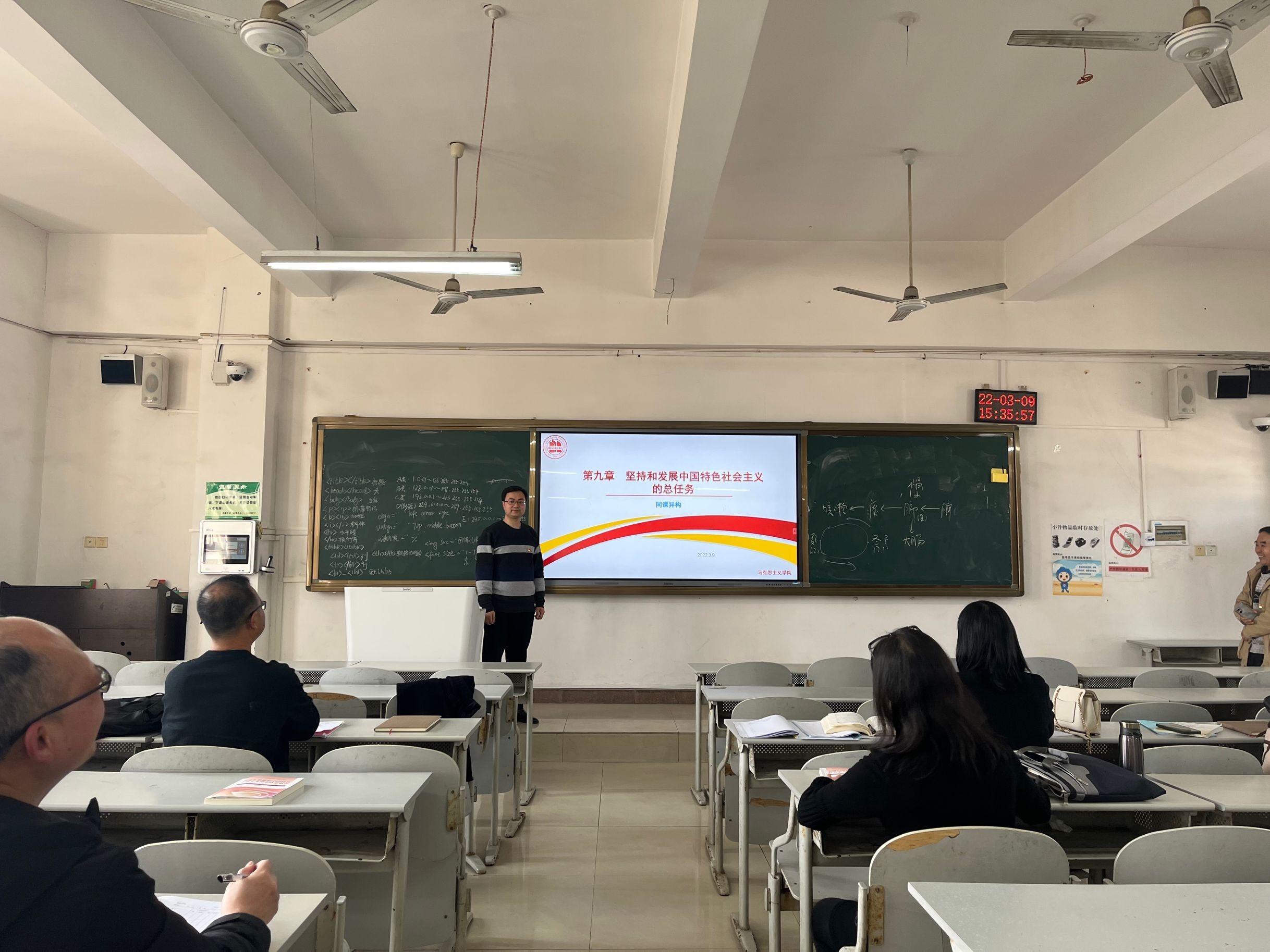 孙杨老师传达了马克思主义学院党政联席会的精神指示。一是教研室集体备课实施改革,目的是群策群力,实现课堂教学整齐划一;二是课程目标修订,按照学院要求对课程目标进行修订,概论课程的课程目标主要是根据教材导内容修订而成,要求教研室教师下载之后认真学习课程目标;三是部署动员教研室成员积极组队参加教学能力比赛,坚持以赛促教,提升教学实效;四是思政课教师做好意识形态研判工作:比如,教学引用的案例一定要精准,正确认识国际局势,微信、QQ等要实名制,僵尸群要解散等等。
