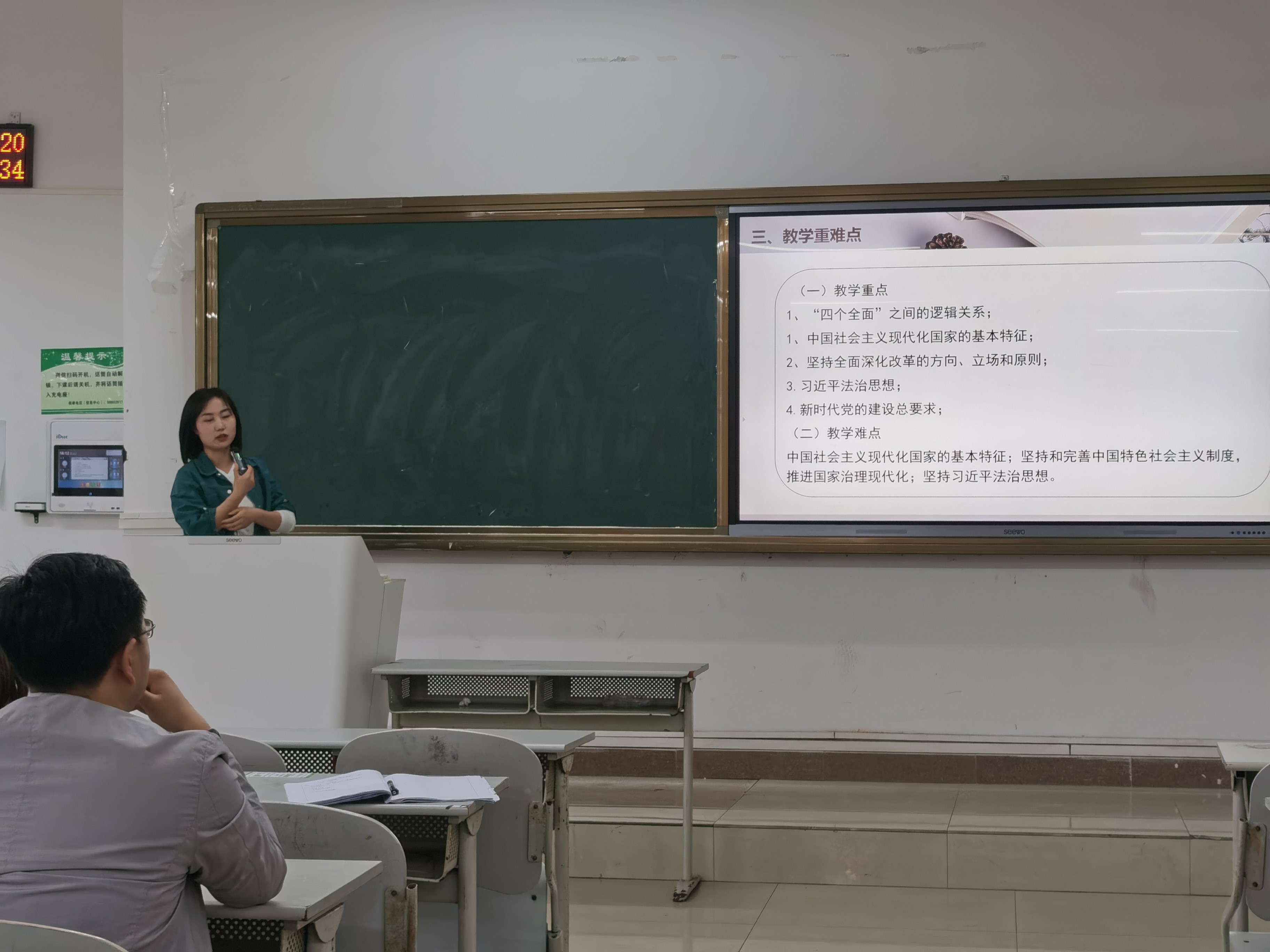 在听完陈红老师分享,首先孙老师肯定了陈老师备课充分,强调了在讲课时应注重给学生梳理清楚“四个全面”的新变化、中国式现代化与西方式现代化的对比等问题,并且指出阐述全面依法治国的时候应注重从宏观上把握,着重强调习近平法治思想;以及讲述全面从严治党的时候应跟后面党的建设章节做好区分,注重重难点内容的详略把握。