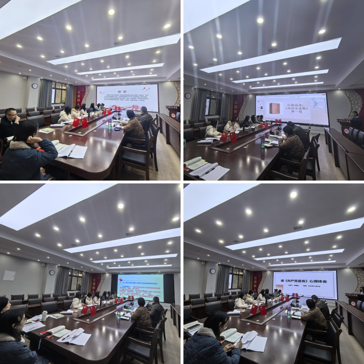 在读书分享中,参会教师分别就《马克思主义哲学基础理论研究》、《关于费尔巴哈的提纲》、《共产党宣言》、《毛泽东选集(第一卷)》等马克思主义经典著作及《人间词话》、《乡土中国》等经典著作进行了交流分享。