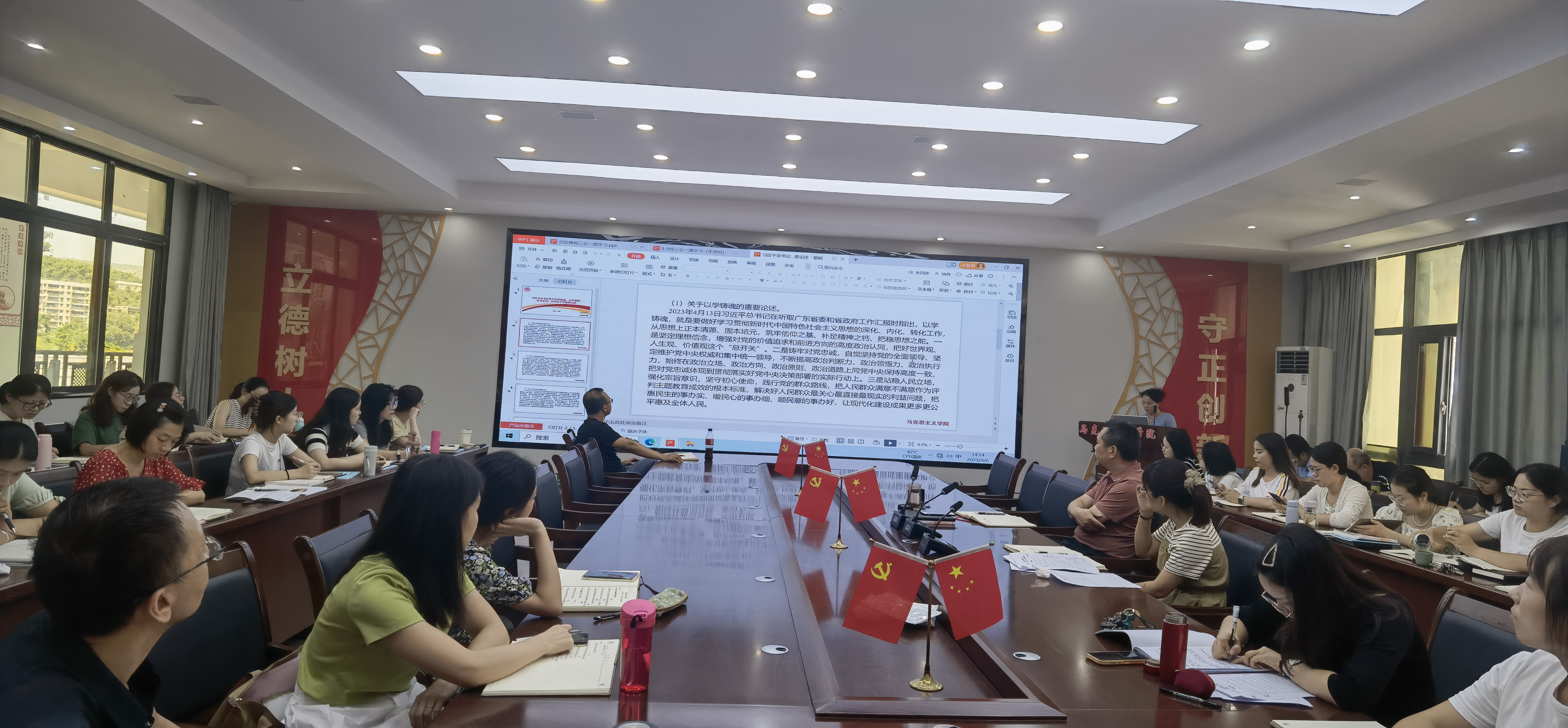 2023年9月6日下午马克思主义学院在奥训楼403会议室,召开了教职工政治理论和师德师风学习会,马院全体教职工参加了学习。