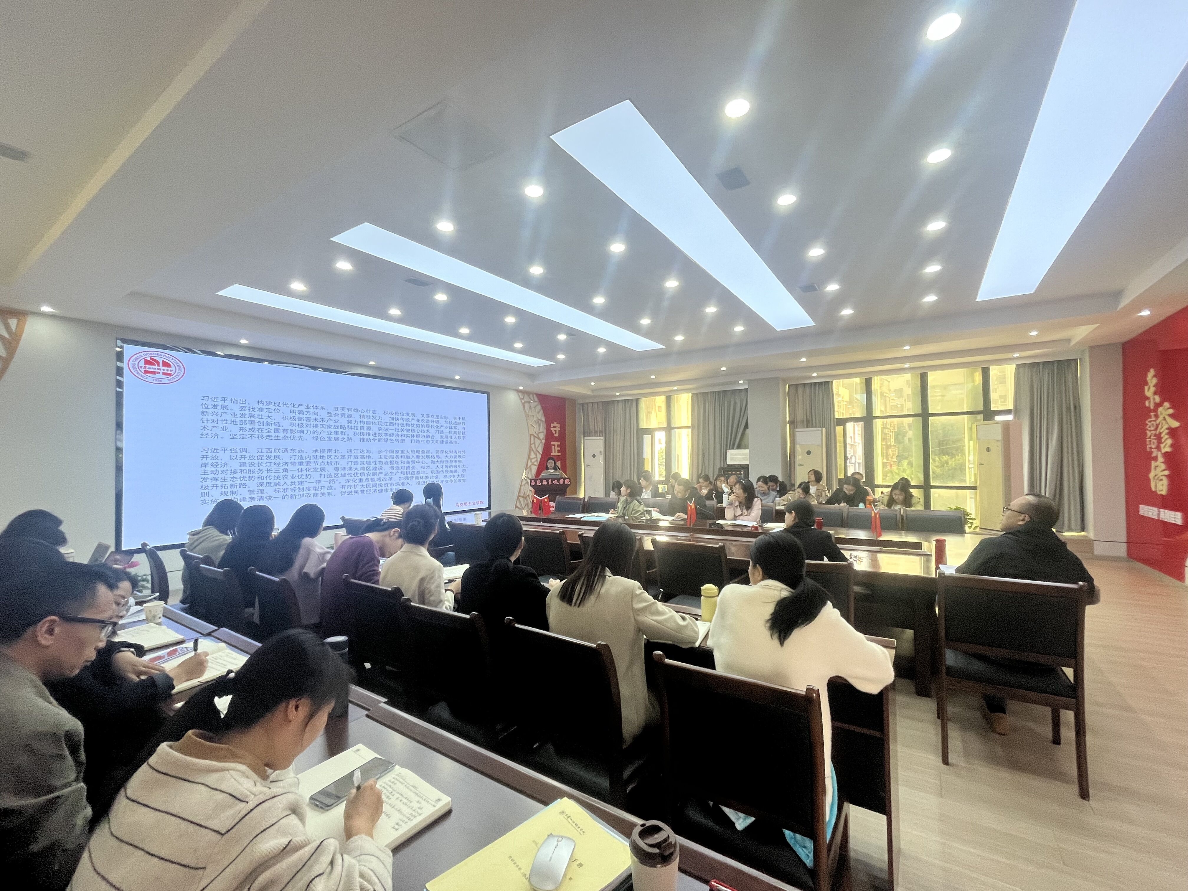 首先由陈丽、姜宇等八位同志带领大家集中学习了习近平总书记在进一步推动长江经济带高质量发展座谈会上的重要讲话精神、习近平总书记在江西考察时的重要讲话精神、习近平总书记在第三届“一带一路”国际合作高峰论坛开幕式上的重要讲话精神、习近平总书记在中共中央政治局第九次集体学习时的重要讲话精神、中共中央政治局10月27日会议重要精神、全国宣传思想文化工作会议精神、中共中央印发《干部教育培训工作条例》、《中华人民共和国爱国主义教育法》等内容;其次,由教师代表寇先琼同志专题学习研讨了《习近平谈治国理政》第四卷 专题七:把握新发展阶段,贯彻新发展理念,构建新发展格局。“学思想、强党性、重实践、建新功”通过本次学习,各位党员同志受益匪浅,一致表示要坚持习近平新时代中国特色社会主义思想为指导,坚持学思用贯通、知信行统一。
