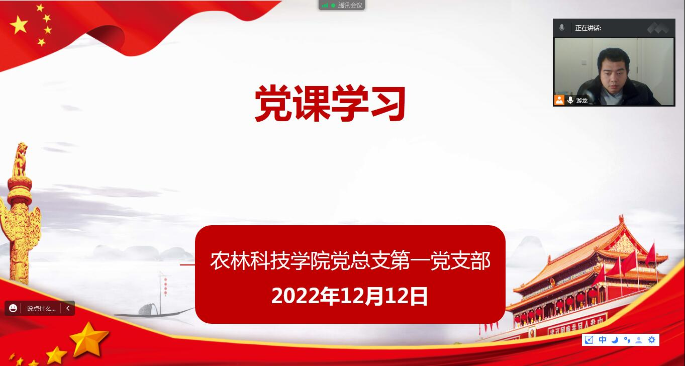 12月12日,农林科技学院党总支第一支部在农林楼607开展“全面建设社会主义现代化国家的政治宣言-党的二十大报告学习体会”专题党课,此次党课由第一党支部书记余夏君主讲。