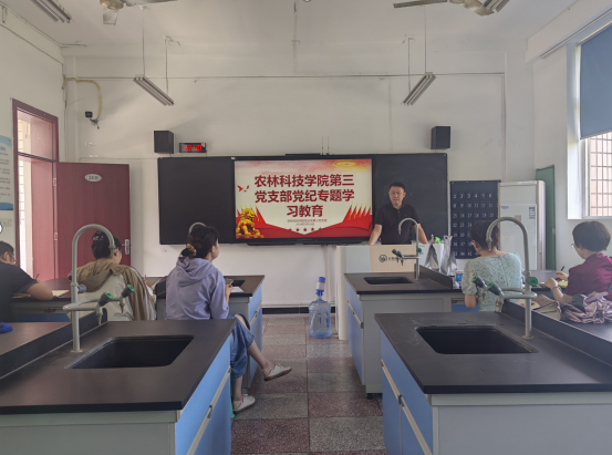 2024年5月16日中午,农林科技学院第三党支部在农林楼308室召开会议,进行了5月份的“三会一课”及主题党日学习,本次会议由支部书记刘一丁同志主持,支部党员共8名同志参加。