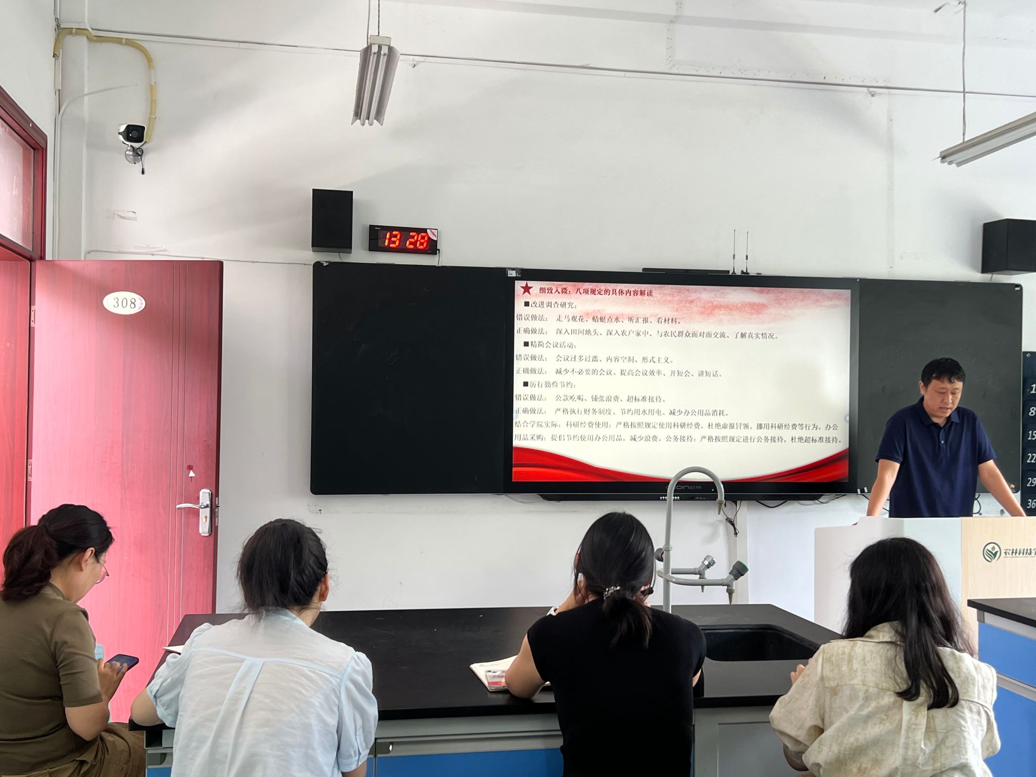 在具体内容解读环节,他结合学院实际,对科研经费使用、办公用品采购等方面提出了明确要求,并强调了严格科研经费管理、杜绝学术不端行为、改进教学方法、提高教学质量、加强师德师风建设、关心学生成长等具体措施。同时,他还通过违反八项规定的典型案例,警示全体党员要时刻保持清醒头脑,筑牢拒腐防变的思想防线。
