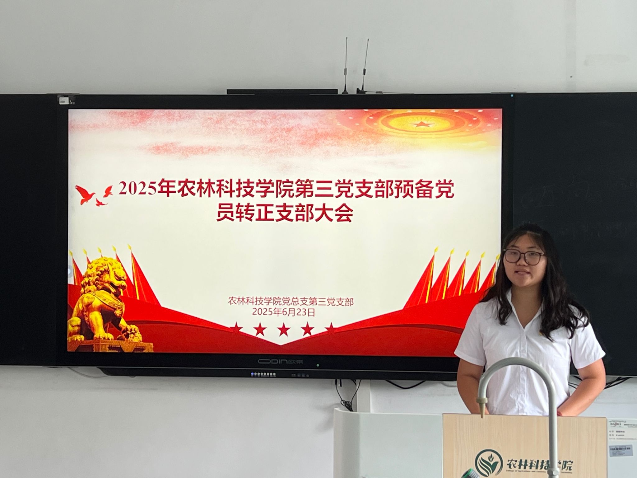 6月23日,农林科技学院第三党支部在农林楼308教室召开预备党员转正大会,会议由党支部书记刘一丁同志主持。
