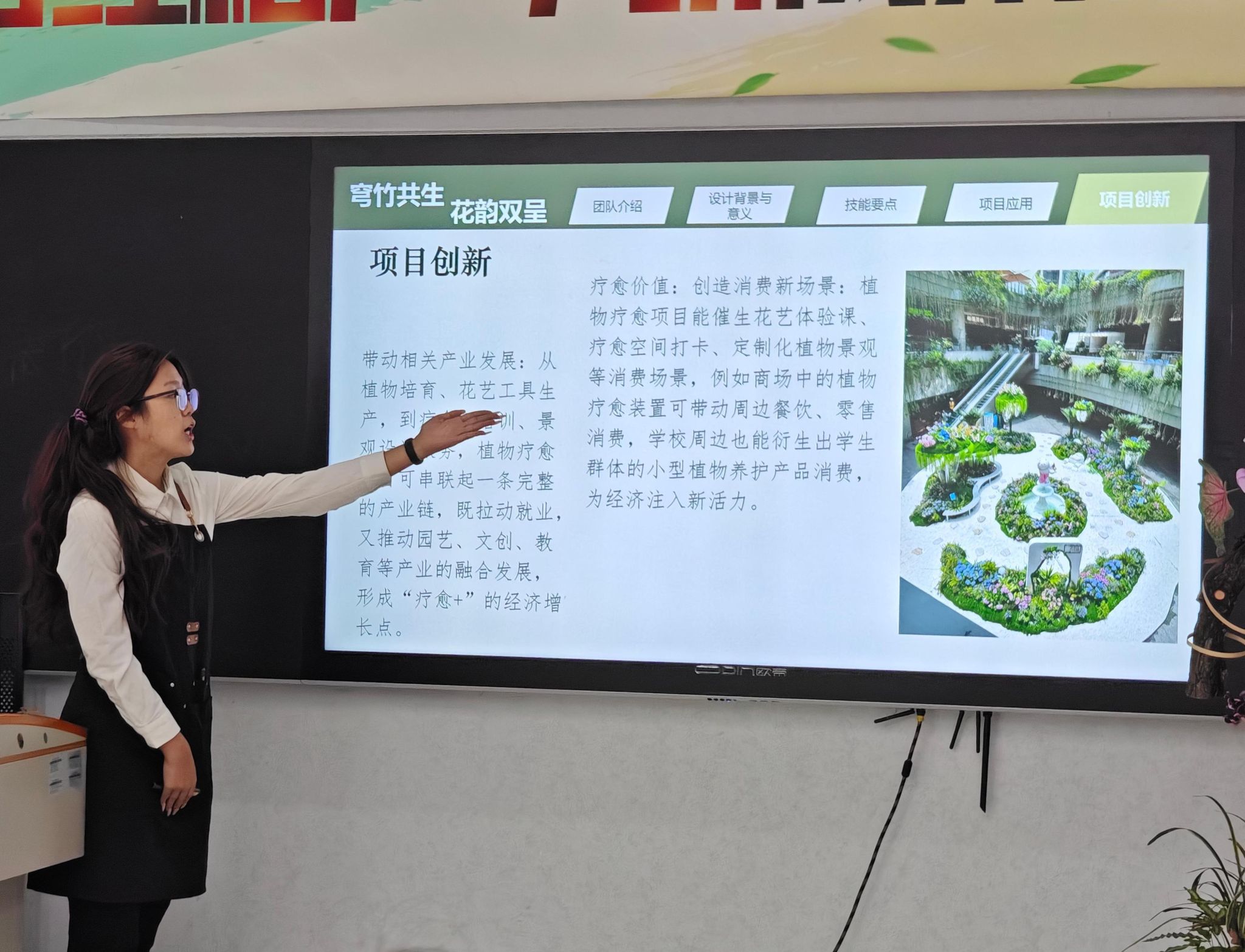 在各赛道初赛的基础上,10月24日,16支在初赛中脱颖而出的队伍参加了学院决赛,最终选拔出了三支优秀队伍。“注定红:朱顶红组培与创新技术”项目团队聚焦朱顶红组培与创新技术,凭借独特的创意和专业的技术,展现了在林业领域的深入探索和实践能力。“竹疏映月,菊淡含烟”项目团队以“道法自然”为核心,将不同生命状态的材料并置,表达了生命的多元状态,隐喻人类在改造世界的同时,也需尊重自然规律,在秩序与野趣间找到共生的美感。“穹竹共生·花韵双呈”项目团队,紧扣现代农业发展需求,立足生态友好与艺术融合,以三峡库区丰富的竹资源为基础,积极响应“健康中国”与“自然疗愈”理念,探索出一条“艺术+自然+心理疗愈”的创新农业发展路径。