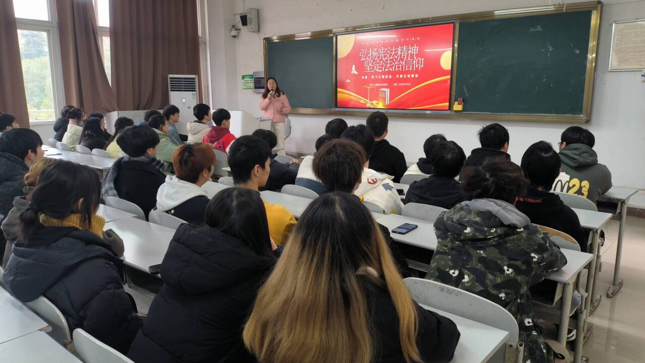 三是以“大力弘扬宪法精神,建设社会主义法治文化”为主题,开展12.4国家宪法日宣教工作,组织各二级学院、各部门做好师生的宪法宣传教育工作,各班级开展好宪法学习主题班会,弘扬宪法精神,提高法律意识,增强法治观念。