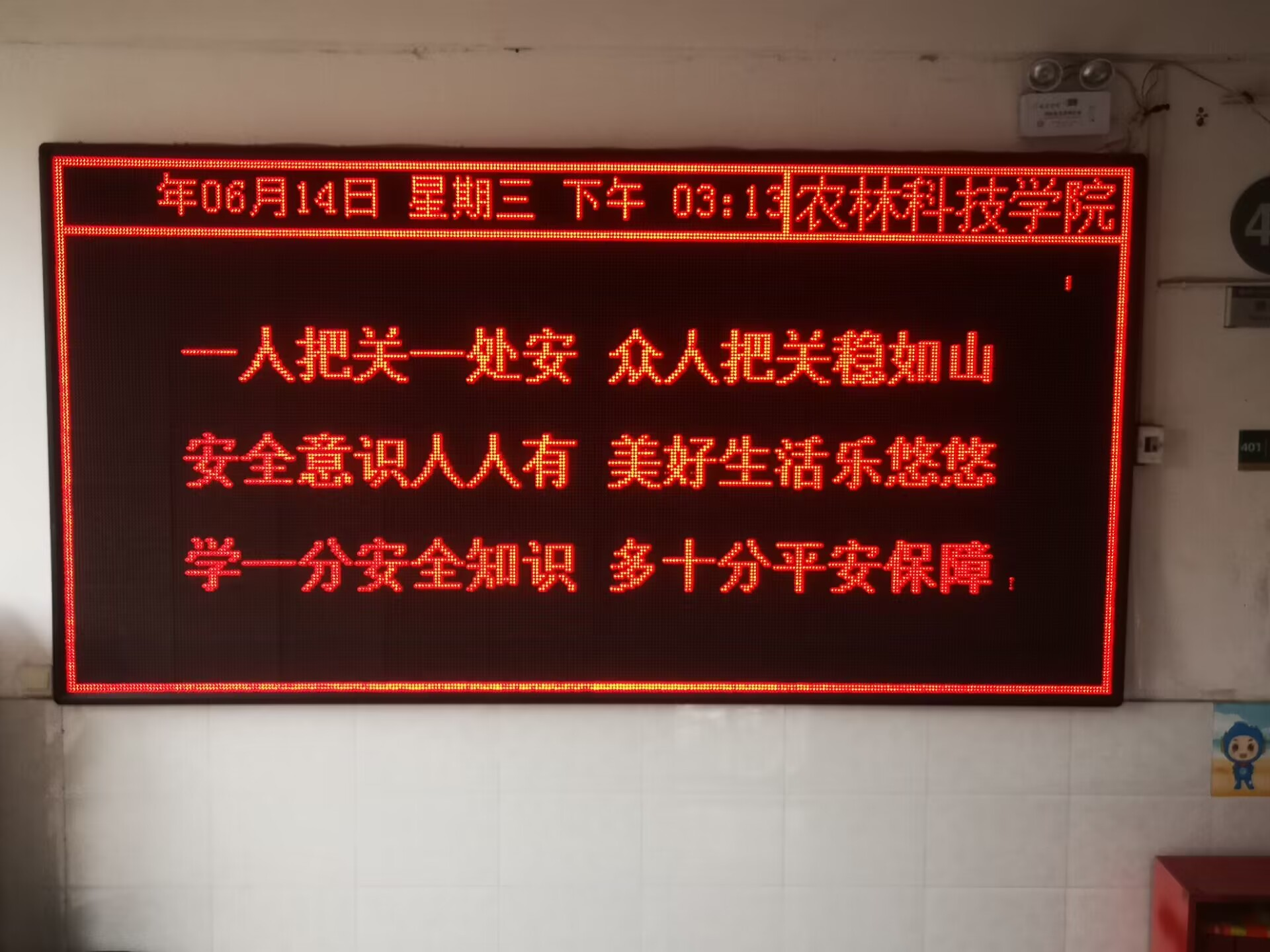 6月1日,在学院沙龙校区综合楼前、奥训楼前、篮球场等醒目位置,悬挂横幅3幅,在农林科技学院LED电子屏幕滚动播放安全标语10条,在篮球场张贴校园安全、消防安全、防灾减灾宣传展板24块,营造了浓厚的校园安全宣传教育氛围。
