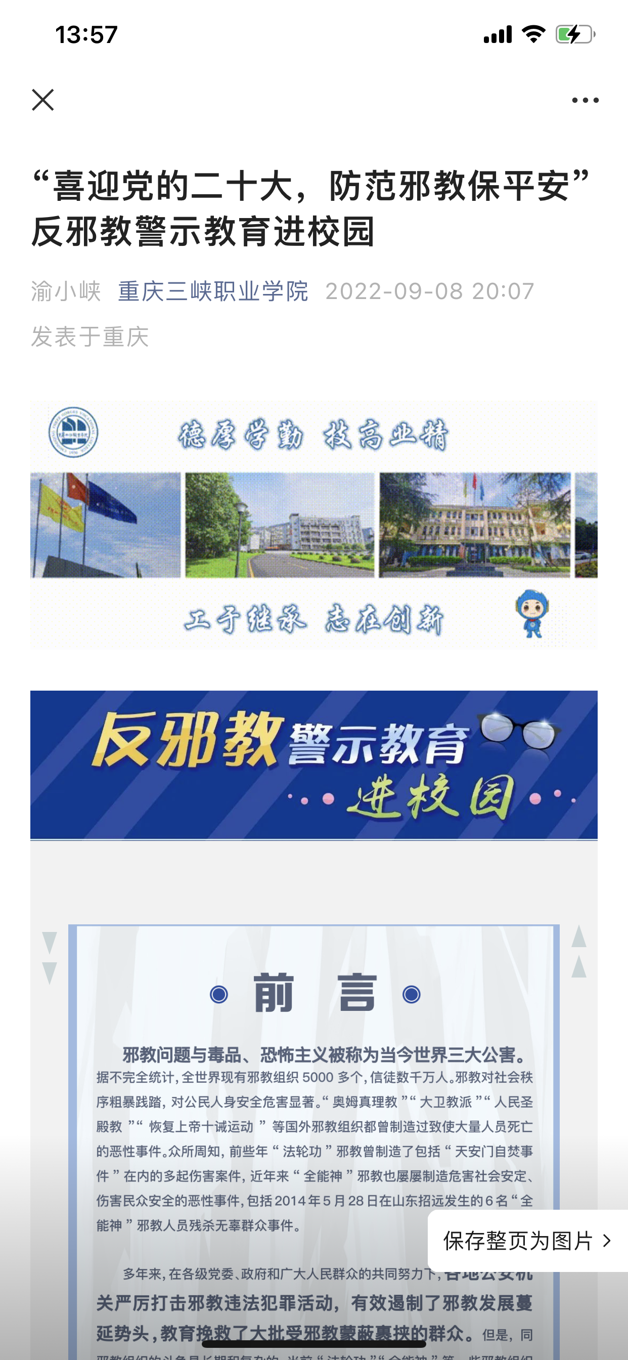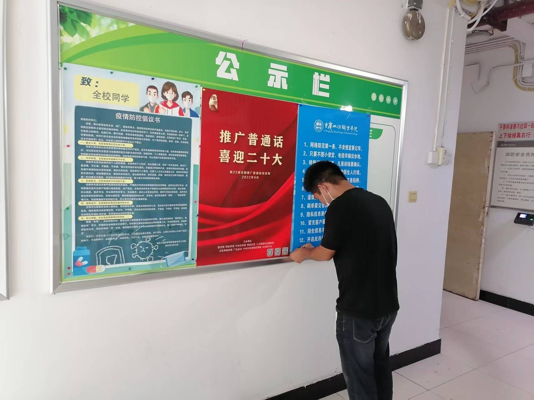 最后编写《2022年秋季开学第一节课安全教育资料》提供各二级学院、各班级组织开展线上开学第一课的安全学习教育。通过QQ、学校微信公众号等平台发布开学季防骗反诈、反邪教、反恐防暴等安全宣传资料,督促各班级开展线上主题班会并形成简报150余份。做好两校区开学季安全宣传工作,挂出安全横幅5幅,展出安全宣传展板8块,张贴防骗反诈宣传海报20余张,在学校LED屏滚动播放反邪反恐等安全宣传知识,发放防骗反邪反恐宣传资料500余份。