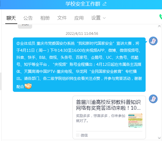 一是通过QQ、微信平台发布国家安全知识学习资料,安排各部门、各二级学院、各班级分别组织专题学习教育,各班级开展主题班会。