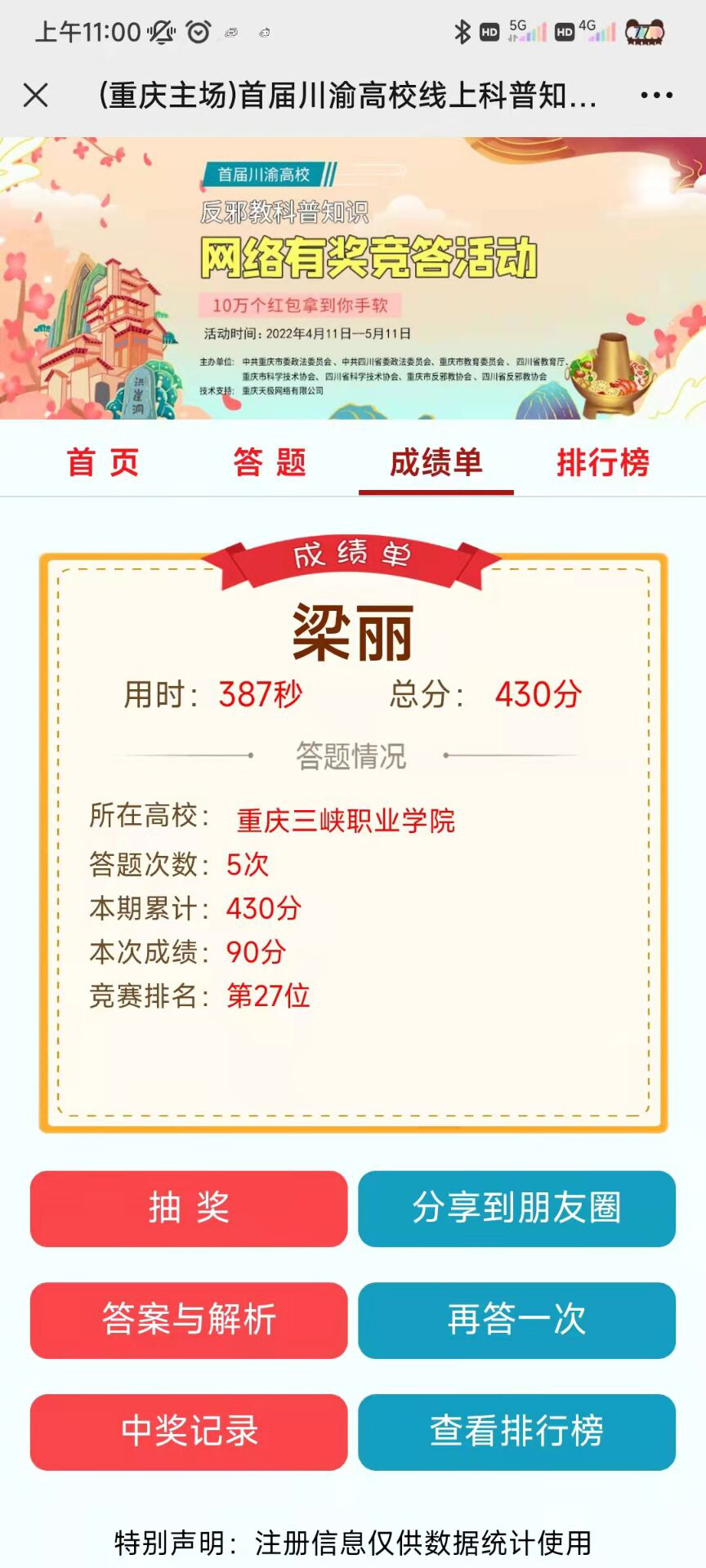 三是在QQ、微信等平台发布反邪教警示宣传教育暨反邪教科普知识网络有奖竞答活动通知,开展“反邪教警示教育进校园”活动,以各班级为单位开展学习及答题活动,学校师生积极参加学习及答题,学校现共有2000余名师生参与答题并获得较好成绩。