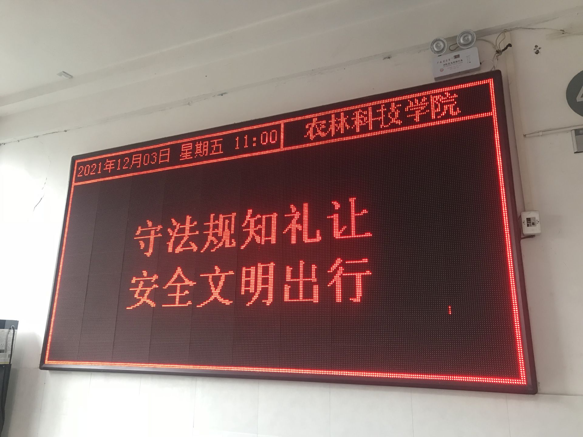 12月2日,安全处专门编印《守法规知礼让 安全文明出行--2021年交通安全专题教育参考资料》学习资料,发放各部门、各二级学院、各班级组织学习。在学院LED滚动播放交通安全宣传标语,同时在校园内悬挂宣传横幅3幅,在学校樟树林进行交通安全图片展,同学们纷纷前来观看学习,营造了浓厚的宣传教育气氛。
