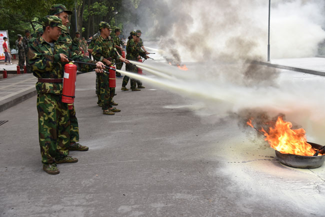 消防器材的正确使用、体验与实战灭火演练活动掀起了整个活动高潮。由消防官兵、安全处工作人员组成的讲解人员走进各连,为同学们现场讲解演示灭火器、灭火毯、消防水带水枪连接的使用方法,并让每位新生亲自动手体验;体验结束后,在全体新生的观摩下,140余名新生代表分为三个大组,先后在樟树林大道进行了灭火器和灭火毯灭火的实战演练。