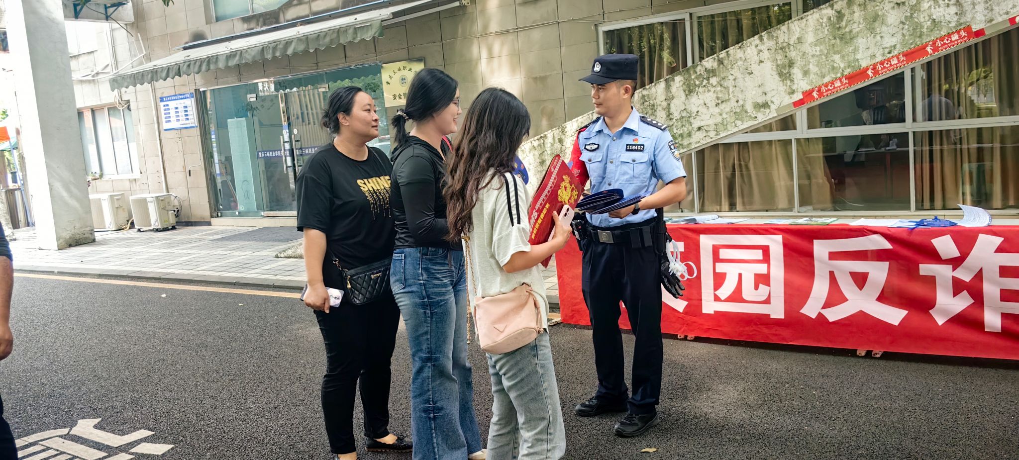 辖区民警借助新生集中报到时段,在校内设置宣传点,悬挂醒目的反诈宣传横幅,摆放安全宣传展板,先后向过往师生发放反诈一封信、反诈宣传扇子等宣传资料2000余份,现场讲解如何使用“国家反诈中心”APP等防范知识。
