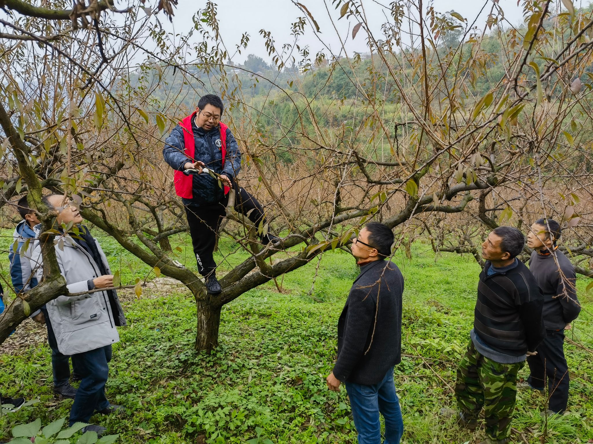 接着支部专门邀请农林科技学院吴琼教授在田间地头为大冲村村民讲解各类果树的种植技术,现场教授树枝裁剪方法,村民们认真聆听学习,针对平时种植方面存在的问题积极向吴教授请教。