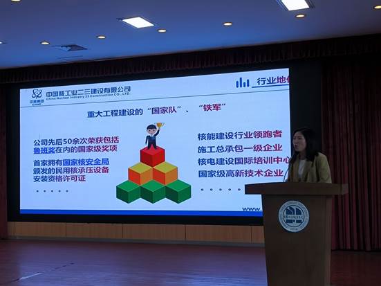 活动最后,有着很强军工背景的企业-中国核工业二三建设有限公司招聘人员到现场进行了企业宣讲和现场招聘,希望优秀的学生能够选择中核集团。