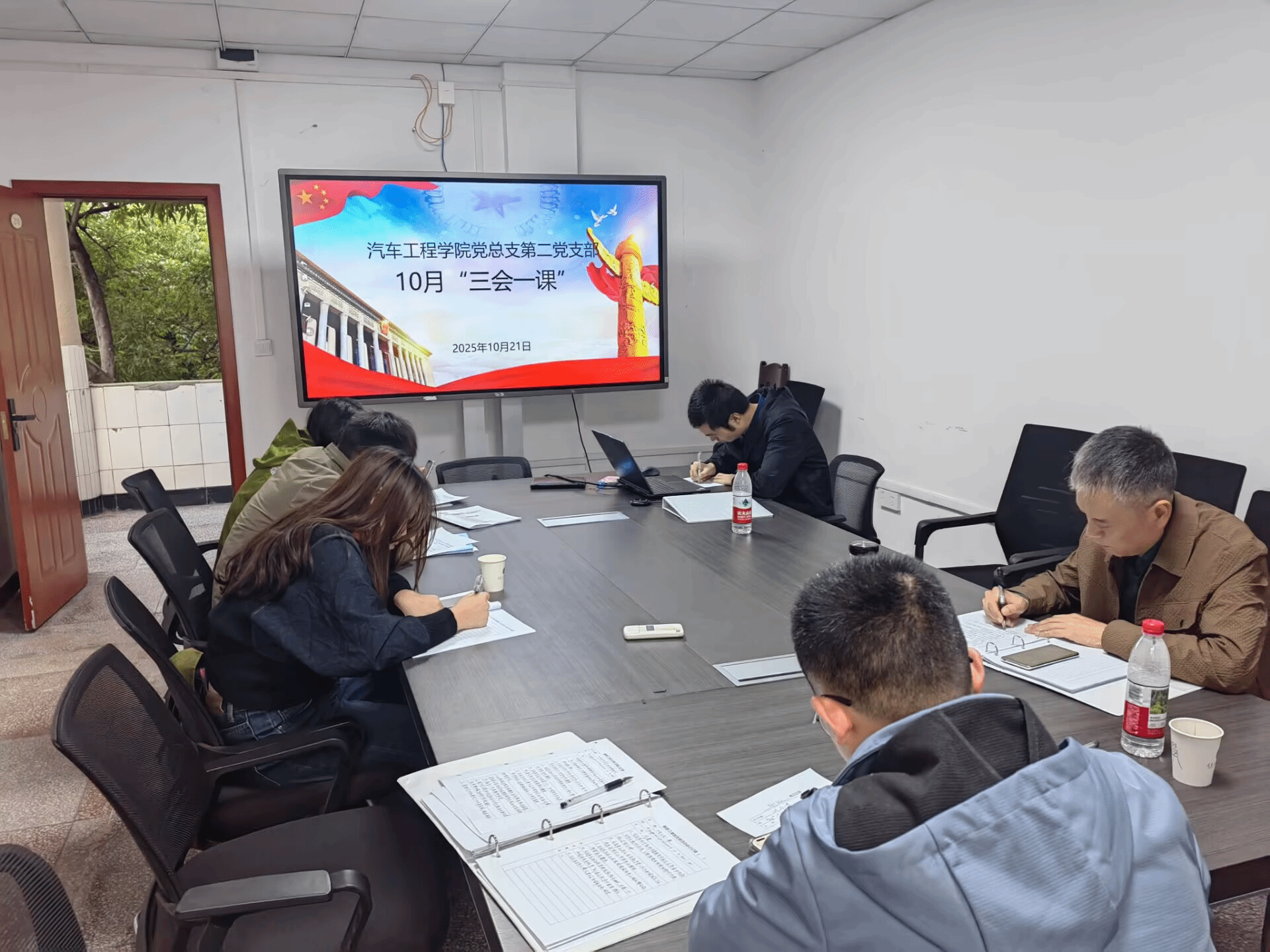 2025年10月21日,汽车工程学院第二党支部在龙都校区知新楼210会议室进行“三会一课”学习,本次会议由闫建同志主持。