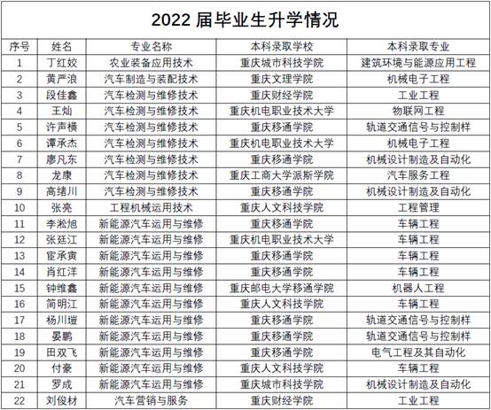 2022年度,汽车工程学院升学考生共计57人,录取23人,升学录取率达40.3%,再创新高。近年来,汽车工程学院高度重视“专升本”工作,鼓励学生通过“专升本”进行学历提升。其中,汽车制造与装配技术专业黄严浪以及新能源汽车运用与维修专业简明江、付豪三名同学荣获2021年度“巴渝工匠”杯重庆市第十四届高职院校学生职业技能竞赛“机器人系统集成”赛项一等奖,并因此免试升本。专升本录取人数及比例屡创新高,是学校高度重视和全体师生共同努力的成果,不仅体现了学生良好的学习水平,更是集中体现了学校的内涵建设。