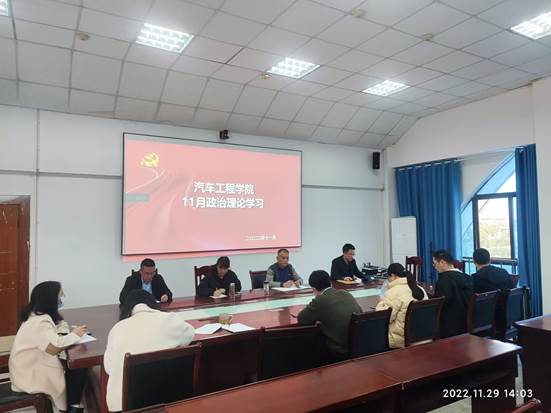 11月29日,汽车工程学院党总支在沙龙校区汽车工程学院会议室通过线上线下相结合的方式开展了11月教职工政治理论学习。会议由汽车工程学院党总支书记夏平主持,党总支宣传委员谢焕组织学习,学院在校教师参加线下集中学习,校外教师参加线上腾讯会议学习。