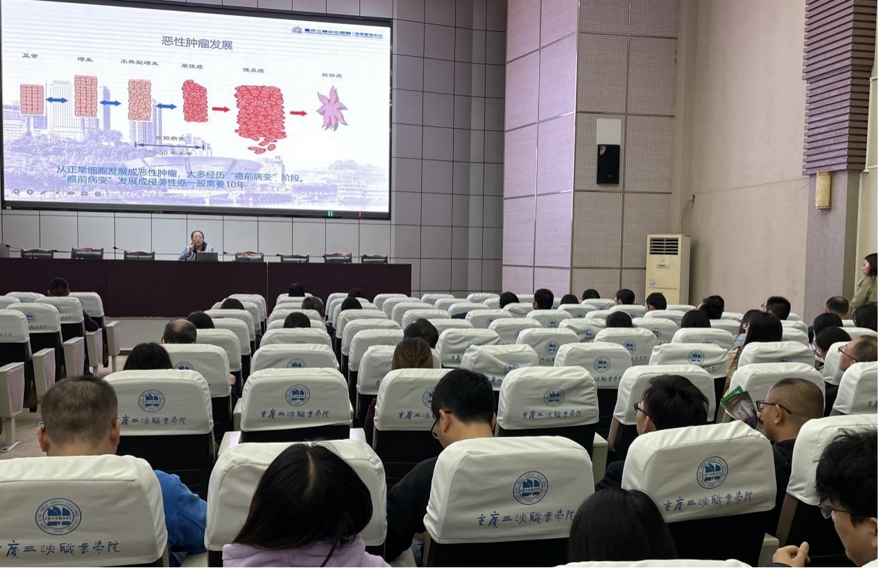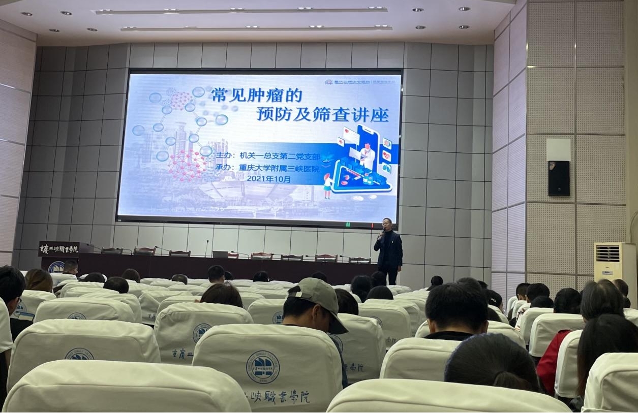 为进一步落实党史学习教育“我为群众办实事”的工作要求,机关一总支第二党支部邀请了重庆大学附属三峡医院健康管理中心主治医师、高级营养师贾茜于2021年10月19日下午16时在学院博雅楼学术报告厅为全校教职工讲解常见肿瘤的预防及筛查相关知识,支部书记柯海浪同志主持此次讲座。