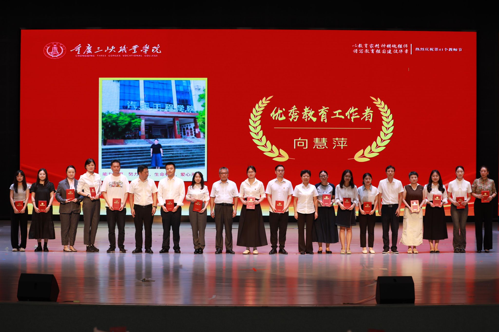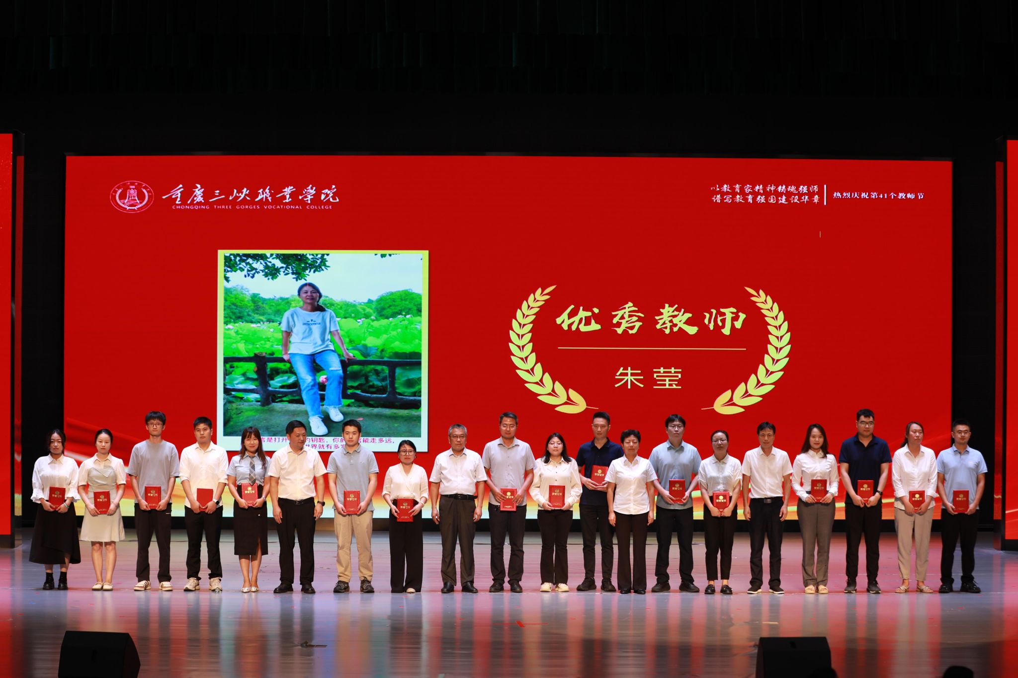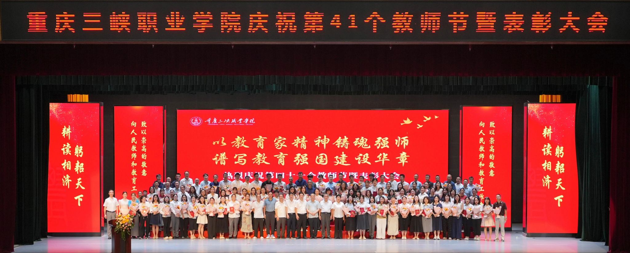 金秋九月,杏坛飘香。9月9日下午,学校在学生活动中心隆重举办第41个教师节庆祝暨表彰大会。学校校长李炯光、党委副书记杨梅、副校长张传师、副校长丁廷发出席会议;全体受表彰教师、新进教职工、教师与学生代表等500余人参加会议。