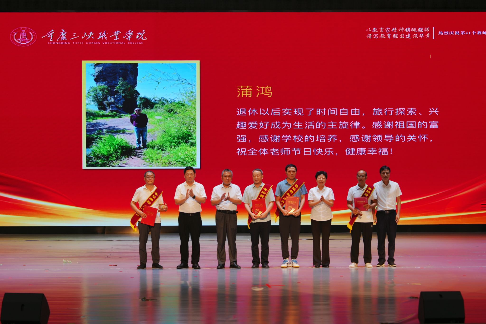 在表彰环节,学校党委委员、副校长张传师宣读了表彰决定。学校领导依次为受表彰教师颁发荣誉证书,为荣休教师佩戴绶带、颁发纪念章,现场掌声如潮,气氛隆重而温馨。