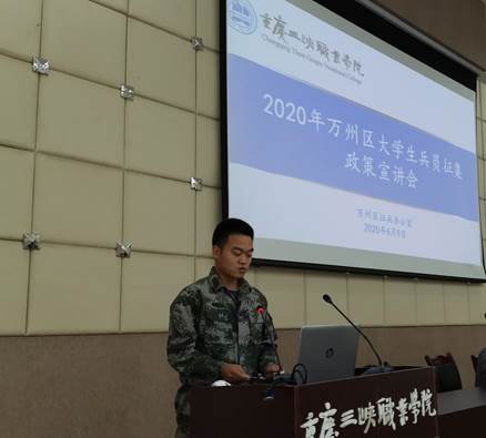 近日,万州区人武部主办我校承办的2020年大学生兵员征集政策宣讲会在博雅楼学术报告厅隆重举行。学校学生处副处长黄莉,万州区人民武装部科长吴燕出席并参加了本次活动。