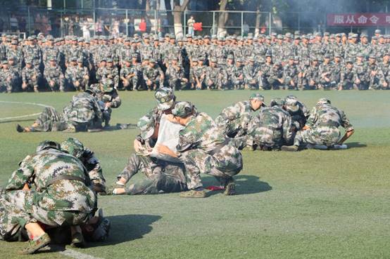 经过14天的军训生活,新生们精神抖擞,气势磅礴,以崭新的风采,列着整齐的队伍,铿锵有力的口号此起彼伏;分列式拉开军训汇报表演的序幕,也展示着军训成果,齐步、正步整齐划一,摆臂、踢腿凌厉有力。随后,两个千人方阵,表演军体拳和手语操,军体拳气势如虹的连贯动作燃炸整个运动场,手语操