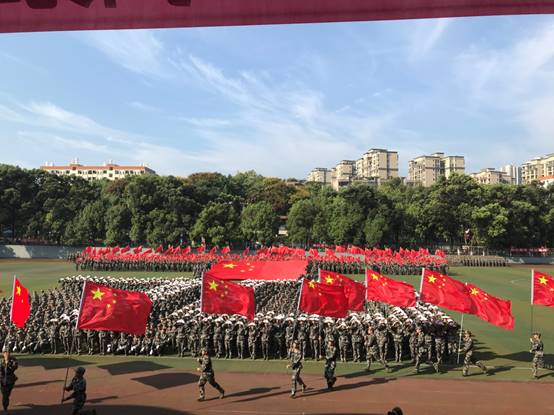 优雅温暖的诉说爱国深情。战场救护和教官擒敌拳则向我们展示了新生专业的训练成果与昂扬向上的精神风貌。最后,伴随《歌唱祖国》的嘹亮歌声,80面国旗由旗手朝气蓬勃的挥舞着入场,方阵摆出的“中国”和“70”的字样, 在“1949,2019,不忘初心,牢记使命”铿锵有力的口号,让鲜艳的国旗在阳光下更显炙热。