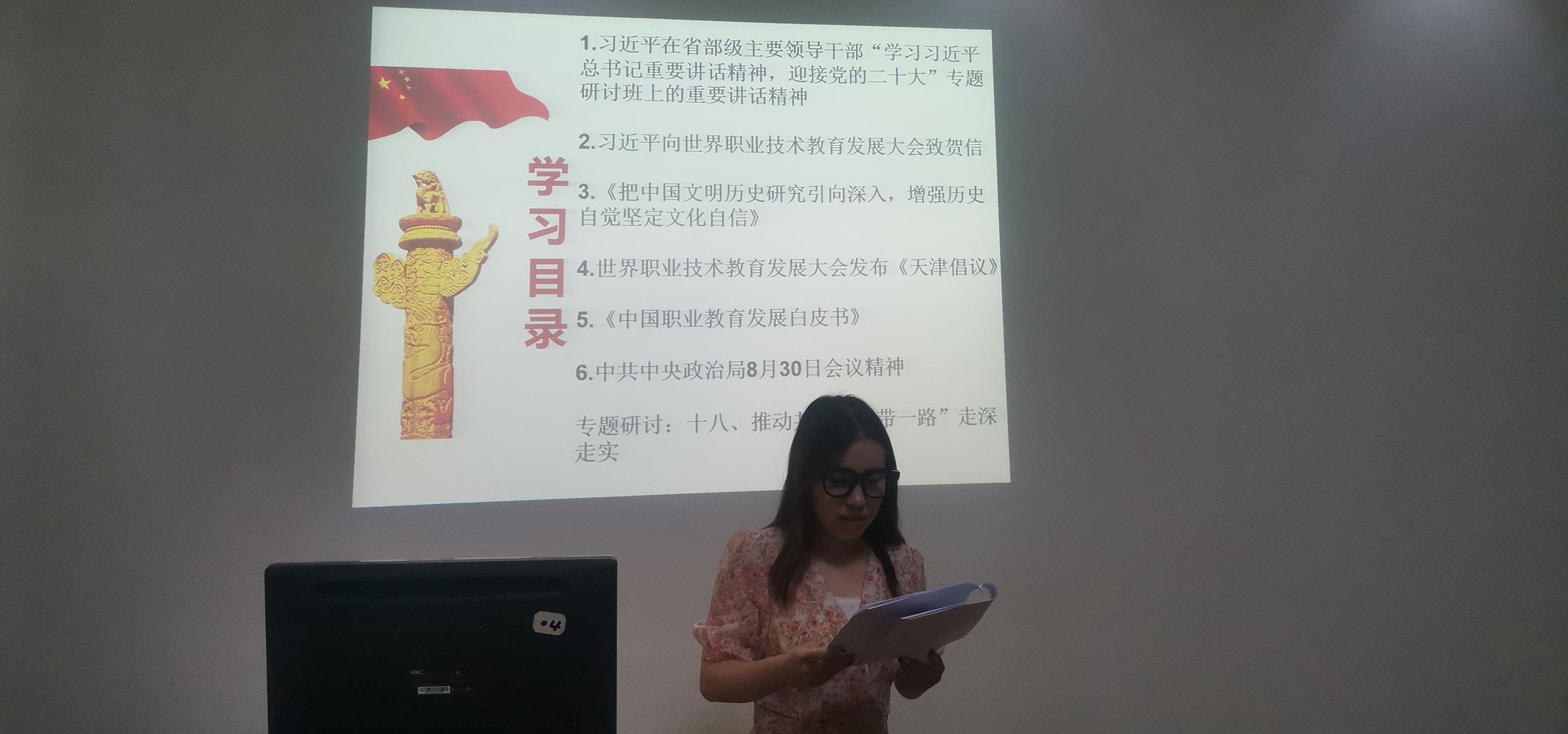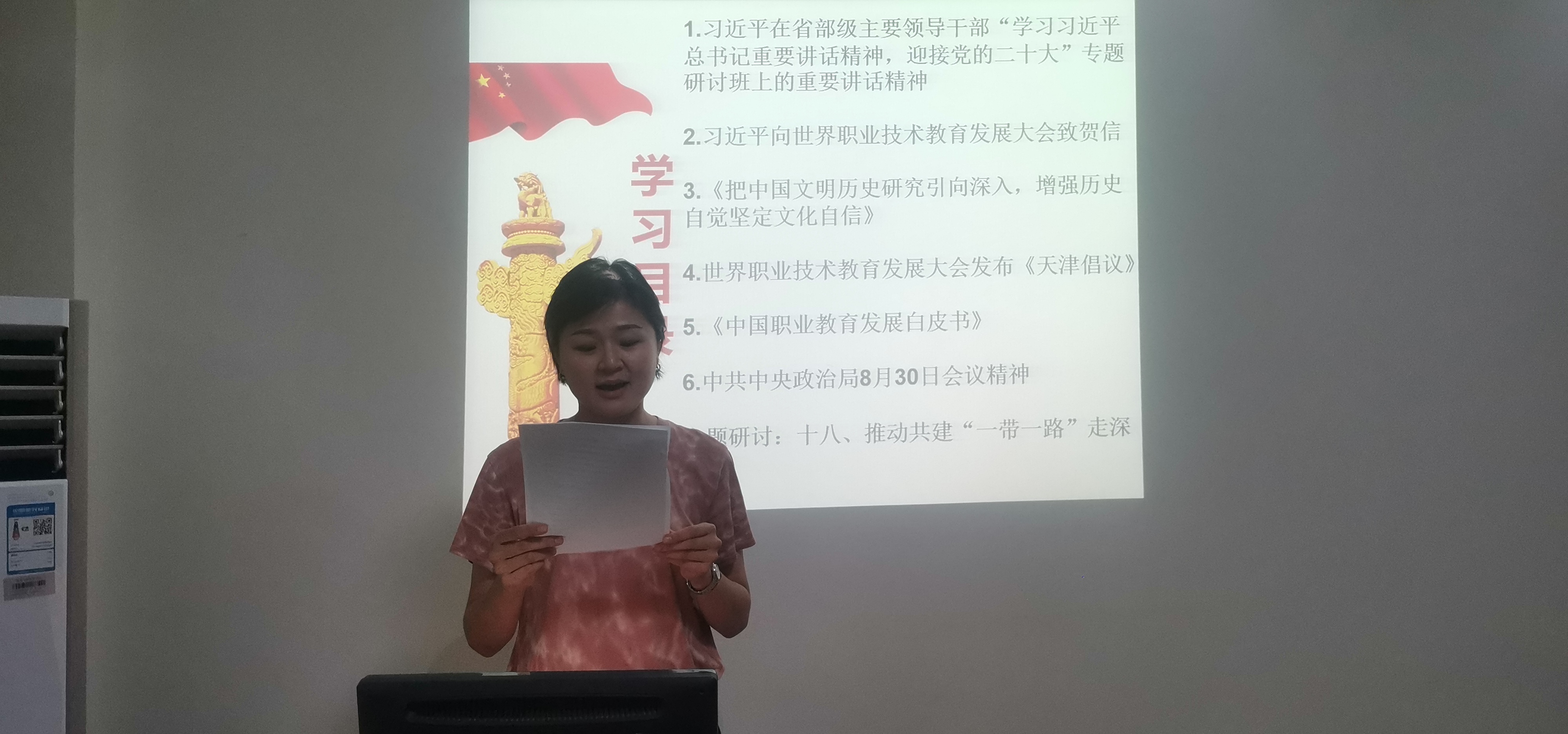 会上,在组织委员杜嘉的带领下,全体党员集中学习了《习近平总书记在省部级主要领导干部“学习习近平总书记重要讲话精神,迎接党的二十大”专题研讨班上的重要讲话精神》、习近平向世界职业技术教育发展大会致贺信、《把中国文明历史研究引向深入,增强历史自觉坚定文化自信》;随后对《习近平谈治国理政 第四卷》(《心怀“国之大者”,切实把增强“四个意识”、坚定“四个自信”、做到“两个维护”落到行动上)进行研讨交流。张玄、赵颖、向丹和喻官秀同志做了交流发言。