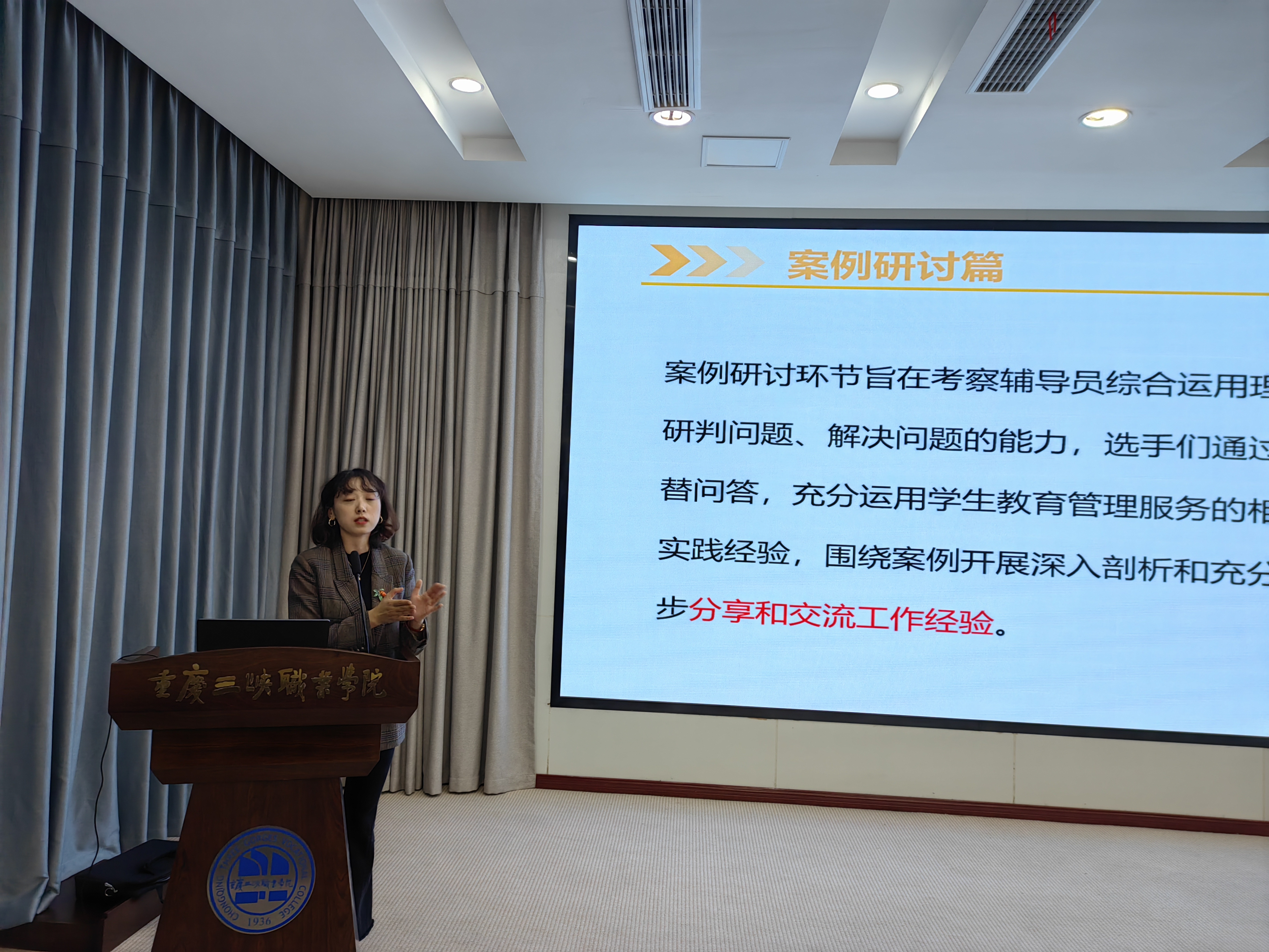 近日,在行政楼303,重庆市“最美高校辅导员”、“重庆市高校辅导员年度人物”、“重庆市优秀辅导员”、“重庆市辅导员素质能力大赛一等奖”获得者史丽涛一行,受学工部邀请,为我校辅导员作了题为《把握三个转变,做好新时代高校辅导员》和《以钉钉子的精神做好“专职”辅导员》的专题讲座。学工部负责人、各二级学院党总支书记、学工科、全体专职辅导员参加了此次培训。