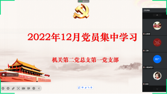 机关二总支第一党支部12月29日开展12月“三会一课”,会议以线上腾讯会议的方式开展,由支部书记彭钦同志主持,支部全体党员集中学习和讨论。