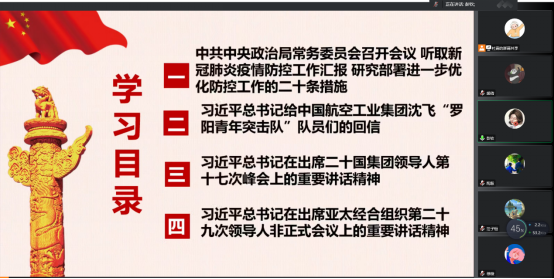会上,王雪同志领学《中共中央政治局常务委员会召开会议听取新冠肺炎疫情防控工作汇报研究部署进一步优化防控工作的二十条措施》,汪子恒同志领学《习近平总书记给中国航空工业集团沈飞“罗阳青年突击队”队员们的回信》,张玄同志领学《习近平总书记在出席二十国集团领导人第十七次峰会上的重要讲话精神》,向丹同志领学《习近平总书记在出席亚太经合组织第二十九次领导人非正式会议上的重要讲话精神》。