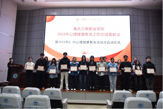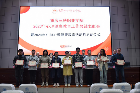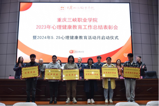 学工部副部长陶毅宣读《重庆三峡职业学院关于表彰2023年度心理健康教育工作先进单位、“优秀心理健康教育工作者”“优秀心理委员”的通报》,对6个先进单位、10名“优秀心理健康教育工作者”和66名“优秀心理委员予以通报表扬。校党委副书记张智等为获奖集体和个人颁发奖牌和奖状。