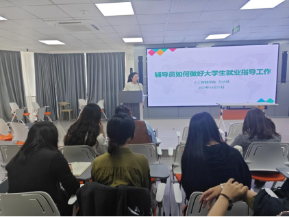 人工智能学院兰小林老师以辅导员如何做好大学生就业指导工作为题,指出在大学生就业指导上,辅导员要引导大学生树立正确就业观、要引导学生做好规划、要锻炼提升学生的求职就业综合能力,要能够整合就业相关信息资源,构建就业服务体系。