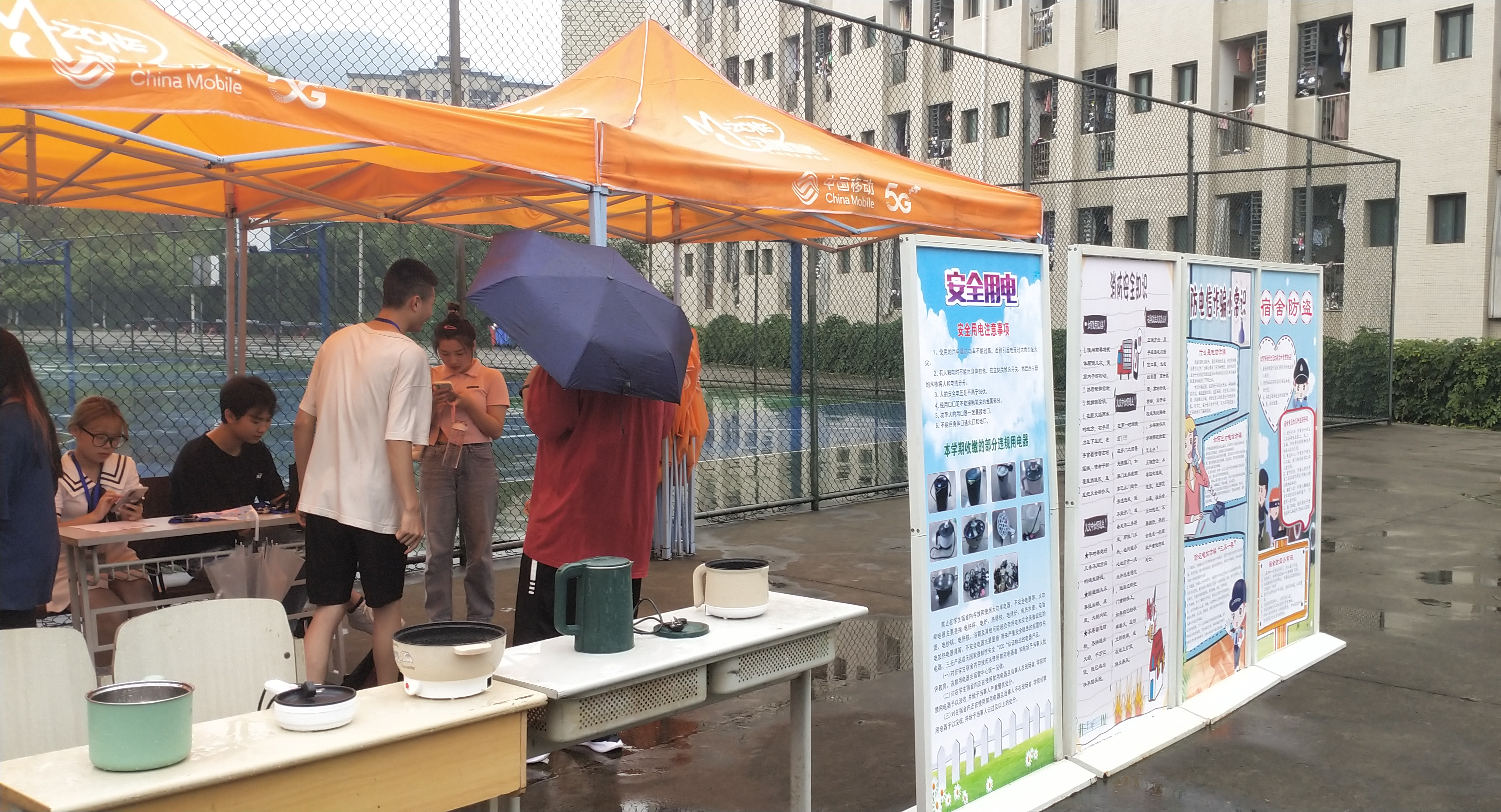 为了加强学生公寓安全文明建设,切实保障学生的人身安全和财产安全,教育引导广大学生提高安全防范和自我保护意识,倡导安全、健康、文明、绿色的生活方式,营造良好的公寓生活环境。6月9日—10日,我院学工部在学院篮球场开展学生公寓安全知识宣传系列活动。活动分为:现场展示“防触电”、“紧急逃生”、“应急”、“防火灾”、“防盗窃”、“防诈骗”等安全知识展板;“电饭锅”、“电磁炉”、“烧水壶”等违规大功率电器的警示;线上学生公寓安全知识调查问卷等。从不同的角度来提高同学们的安全意识并警示同学们在接下来的学习生活中做到不使用大功率电器,做到人走灯息、人走电断、人走门锁等安全防范措施。