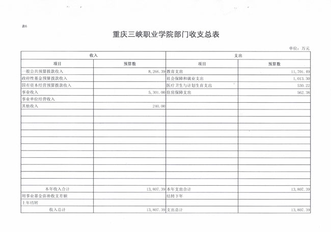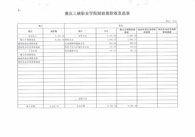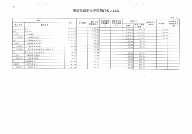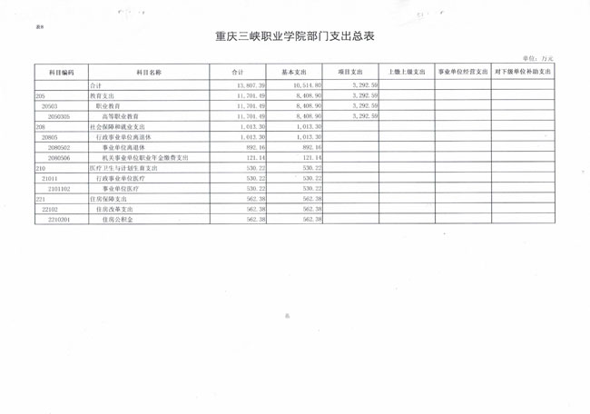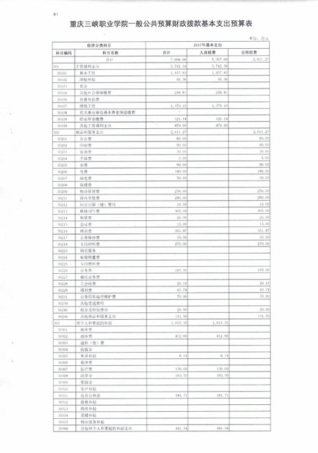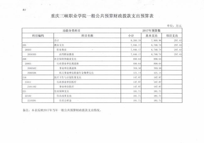 2017年学院一般公共预算财政拨款收入8266.39万元,一般公共预算财政拨款支出8266.39万元,比2016年增加643.66万元。其中:基本支出7968.96万元,比2016年增加481.51万元。主要原因是:基本工资和退休金调标、增加职业年金预算、医疗保险和住房公积金缴费基数提高、学生助学金预算增加等,主要用于保障在职人员工资福利及社会保险缴费,退休人员退休费及落实建卡贫困学生生活补助等,而保障部门正常运转的各项商品服务支出没有增长;项目支出 297.43 万元,比2016年增加162.15万元,主要原因是增加重庆市级高等职业院校专业能力建设(骨干专业)项目建设资金预算,主要用于七个专业的市级专业能力建设(骨干专业)项目。