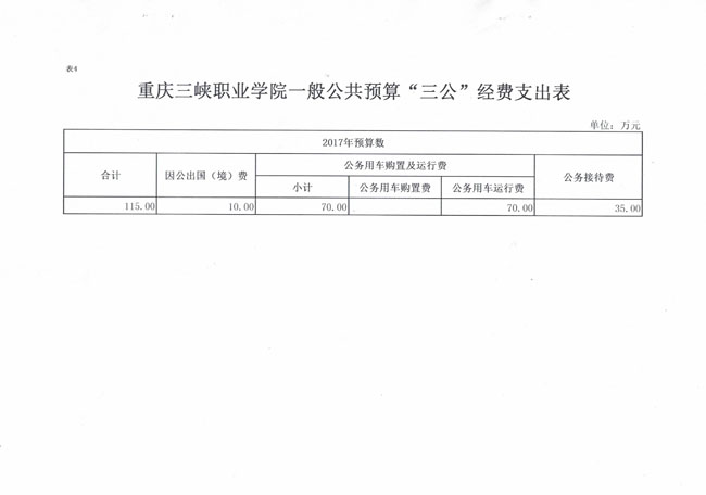 2017年“三公”经费预算115.00万元,比2016年“三公”经费预算115.00万元没有增加。其中:2017年因公出国(境)费预算 10.00万元,公务接待费预算35.00万元,公务车购置及运行维护费预算70.00万元都同2016年预算数一致没有增加。2017年和2016年预算都无公用车购置费。