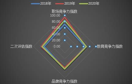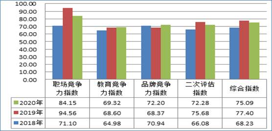 2018-2020年间,我校“教育竞争力指数”和“品牌竞争力指数”一直呈上升趋势,“职场竞争力指数”和“二次评估指数”在经历了2019年快速增长后,2020年略有回落,学校的综合实力在全国排名逐年提高。