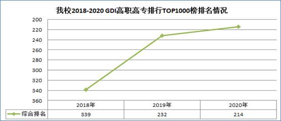 在2018年评价的1388所高职高专中(包括1068所公办高职高专,318所民办高职高专,2所中外合作办学高职高专),我校综合排名第339位;在2019年评价的1400所高职高专中,综合排名第232位,较2018年上升107位,排名有大幅度提升;2020年发布的国内1414所高职高专综合排名情况中,我校名第214位,排名整体呈上升趋势。