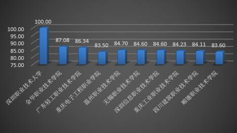 综合榜单排名前十的院校中,深圳职业技术大学、金华职业技术学院、广东轻工职业技术学院占据前三名。重庆有两所院校上榜,分别是排第4位的重庆电子工程职业学院(85.30)和第8位的重庆工业职业技术学院(84.23)。