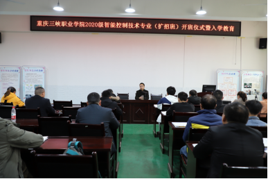 2021年3月12日下午,智能制造学院2020级智能控制技术专业(扩招班)开班仪式暨入学教育在奥训楼308举行。智能制造学院党总支书记、院长熊江,副院长徐明灿,智能控制专业技术专业主任赵伟,教学科科长魏向京,扩招班辅导员伍玉琴及全体扩招班同学参加了此次开班仪式。仪式由智能制造学院学工科科长吴莉莎主持。
