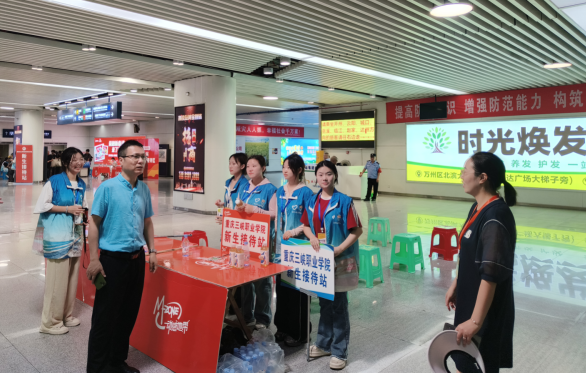 在万州高铁北站,迎新志愿者们忙碌的身影成为一道亮丽的风景线。他们以饱满的热情和真诚的微笑迎接每一位新生及家长,为他们提供引导、搬运行李等贴心服务。