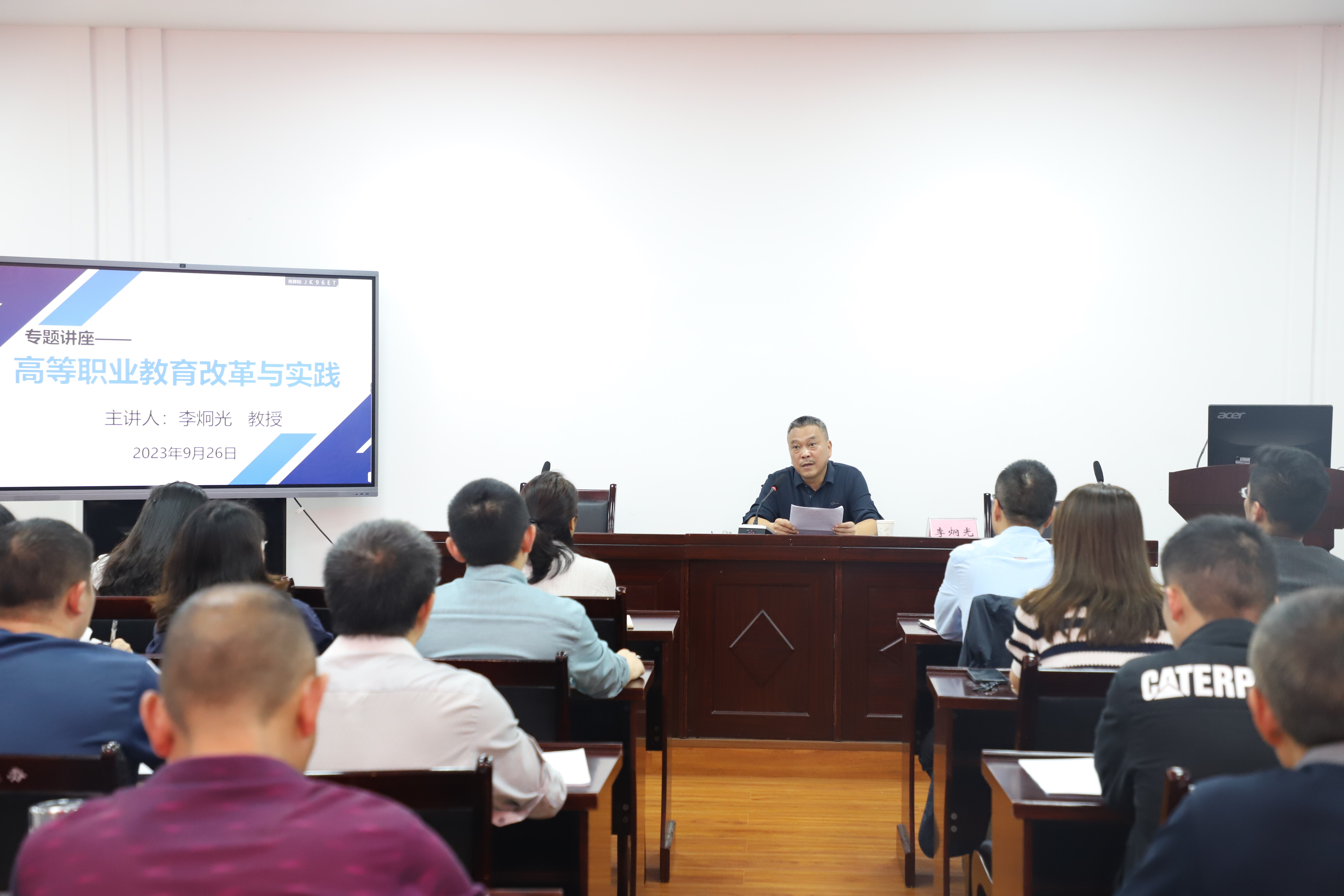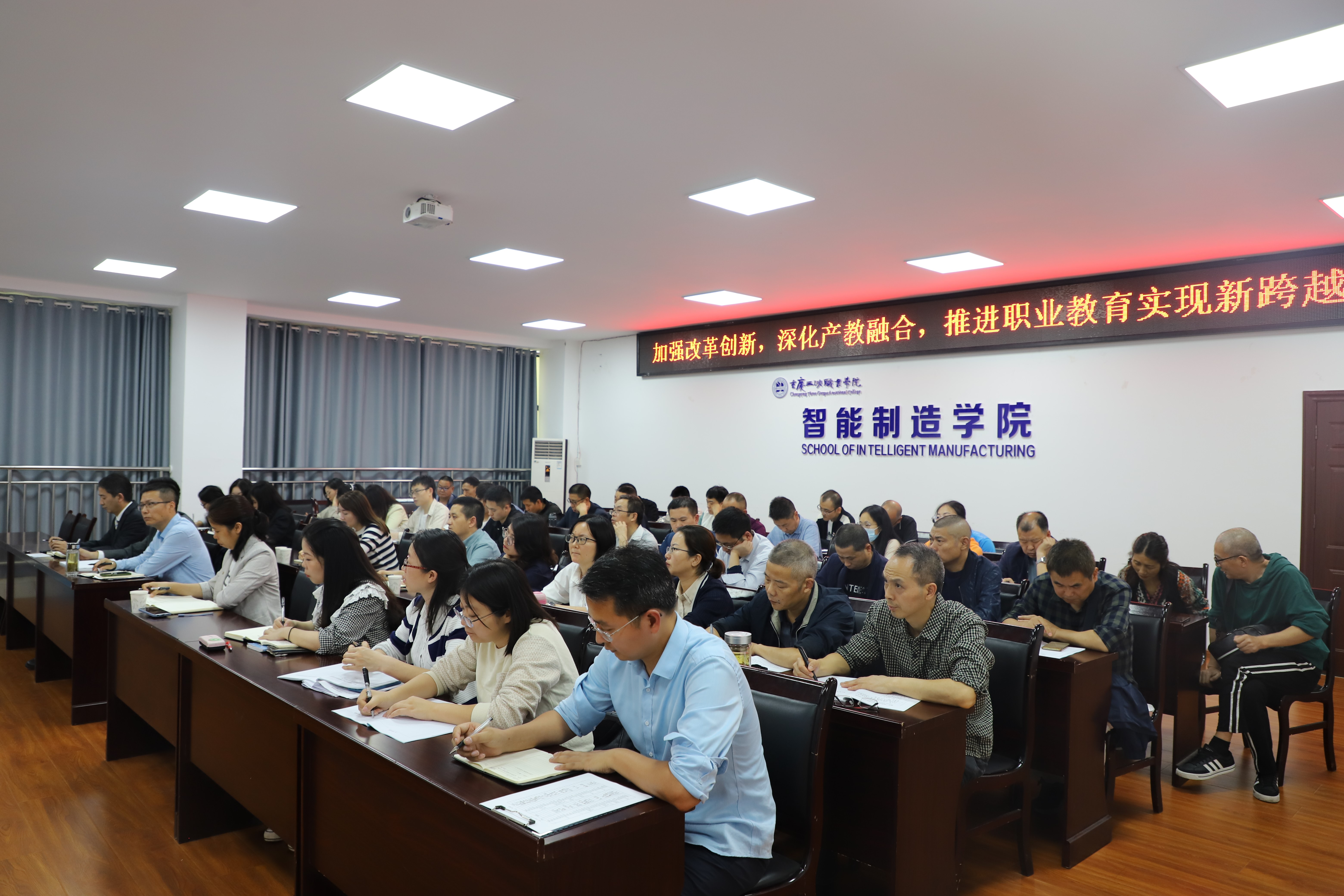 9月27日下午,学院院长李炯光携教务处杨俭处长一行到智能制造学院指导工作,并在奥训楼308会议室为智能制造学院全体教师作了“职业教育的内涵特征与要求”的专题讲座,智能制造学院党总支书记、院长熊江,副书记黄滔、副院长郎朗,教务处副处长杨俭、刘艳宾、幸荔芸及学院教师共计60余人聆听了讲座。