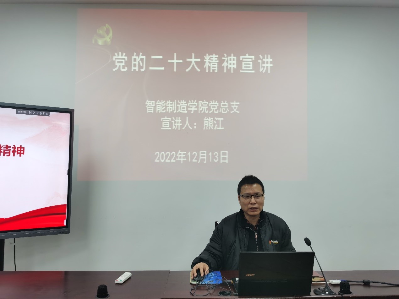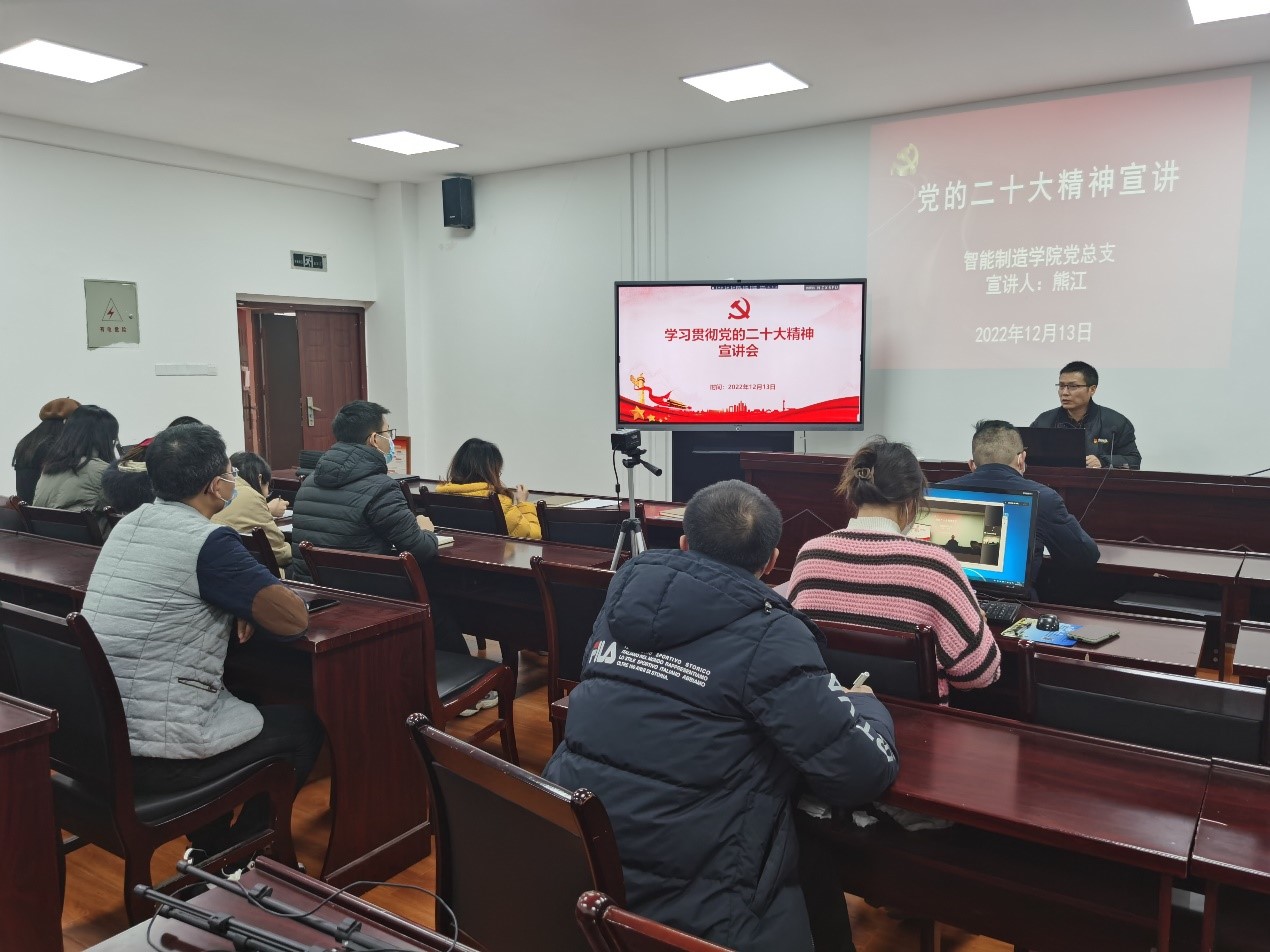 为深入学习宣传贯彻党的二十大精神,推进党的二十大精神进校园,按照学校党委关于《学习贯彻党的二十大精神“进校园”宣讲工作方案》安排,12月13日下午,智能制造学院党总支书记熊江在奥训楼308会议室通过线上+线下的方式为全院教职工作了党的二十大精神专题宣讲。