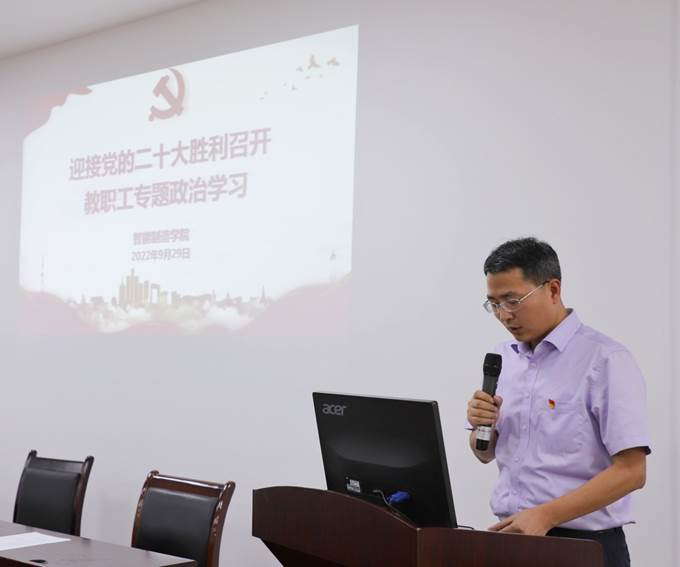 9月29日下午,智能制造学院党总支在奥训楼308会议室召开了“迎接党的二十大胜利召开”教职工主题政治学习会。学校党委委员、宣传部部长、马克思主义学院院长姜荣参加会议并讲话。智能制造学院党总支书记、院长熊江,副书记黄滔以及全体教职工和学生代表参加了学习会。