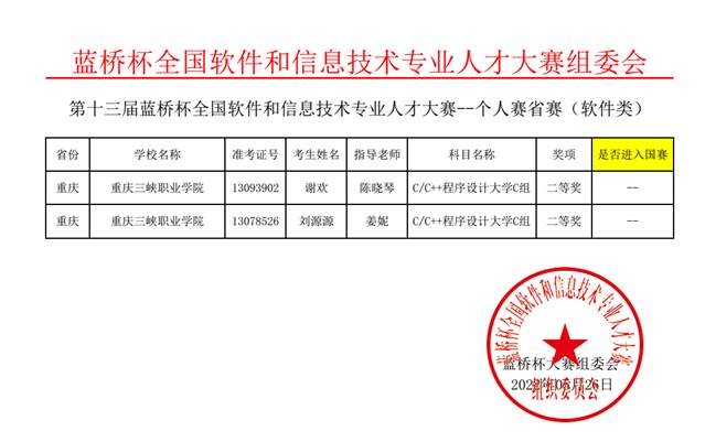 近日,由工信部主办的“第十三届蓝桥杯全国软件和信息技术专业人才大赛”省赛已顺利结束,来自重庆市20多所高校的500余名选手参赛。我院陈晓琴老师指导学生在“单片机设计与开发”(大学组)项目中获得一等奖1项、三等奖1项;姜妮老师、陈晓琴老师指导学生在 “C/C++程序设计”(高职高专组)项目中获得二等奖2项。一等奖获奖选手姚兴系我院20级电子信息技术专业学生,他将代表重庆市参加“单片机设计与开发”(大学组)国赛。