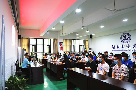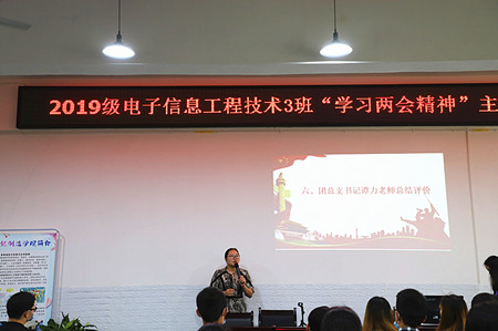 为深入贯彻学习2020年全国“两会”精神,引导团员青年关注时政国情,提升青年人的思想觉悟,深化青年人的时代责任和使命担当,6月18日上午,2019级电信3班开展了“学习两会精神 做新时代青年”主题团日活动。智能制造学院党总支书记、院长熊江教授,学工科科长吴莉莎,团总支书记谭力以及各班辅导员老师、团支书代表参加了此次活动。
