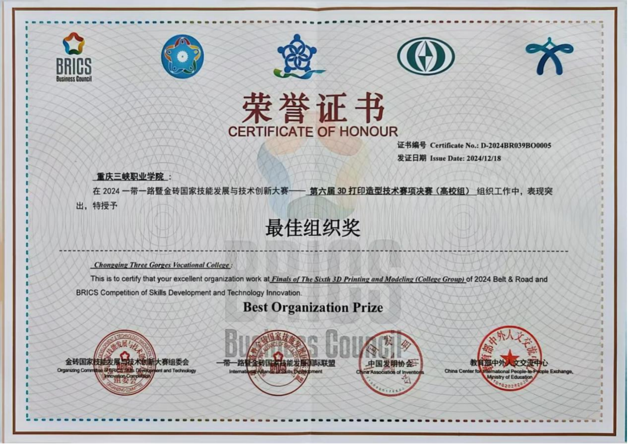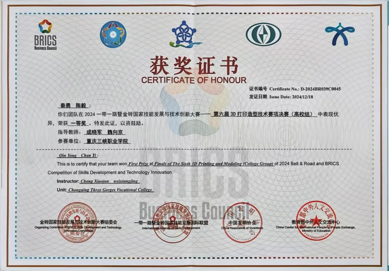 本次大赛由金砖国家工商理事会中方理事会主办,毕节工业职业技术学院承办。来自全国30余所高校参赛,经过3天长达15个小时的激烈角逐,重庆三峡职业学院智能制造学院增材制造技术专业学生秦勇、陈毅获得一等奖,教师成晓军、魏向京获得优秀指导教师奖,重庆三峡职业学院获最佳组织奖。